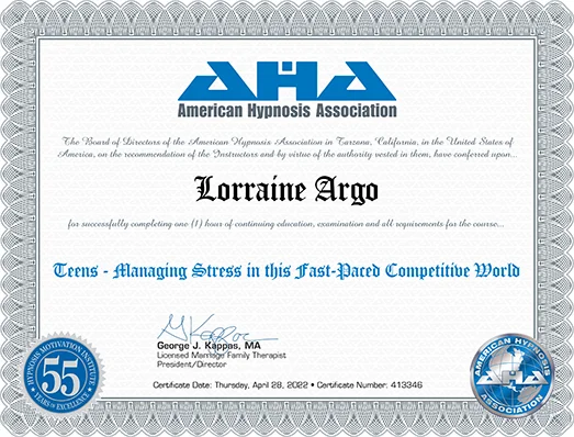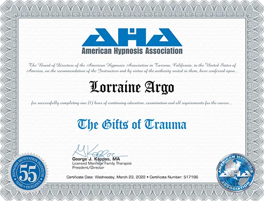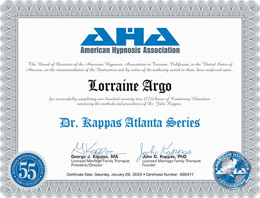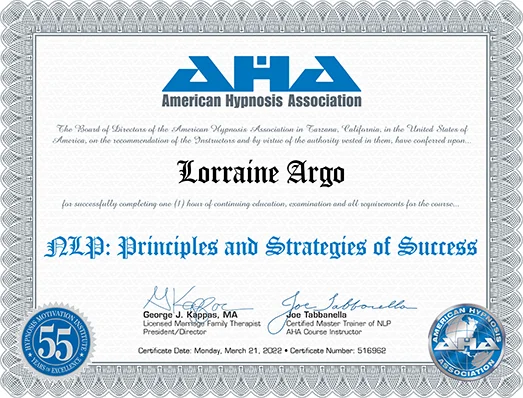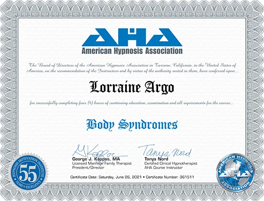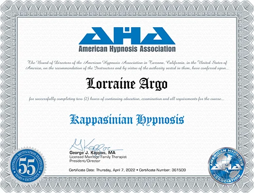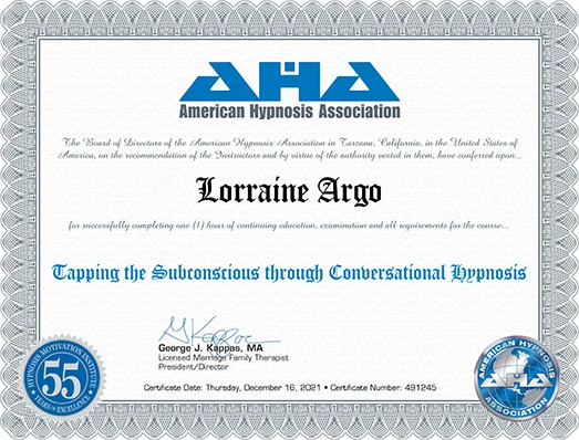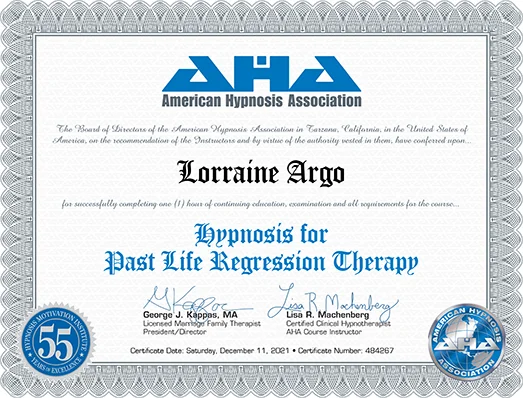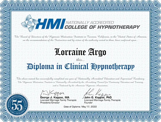 Lorraine is a Certified Clinical Hypnotherapist (CCHt) – training under the highly accredited Hypnosis Motivational Institute, she completed the 1440-hour, 2-year, Clinical Hypnotherapy, plus the AOS Mind-Body Psychology Degree Program, fulfilling all the requirements for Certification as “Clinical Hypnotherapist” with the American Hypnosis Association. This title is reserved for individuals that have met the requirements of Certified Master Hypnotist above, and also possess an accredited Masters, PhD, or AOS Degree in Psychology, in addition to regular continuing educational certification courses. She is also a member of the honored HMI’s Founders Club, with the mission of promoting hypnotherapy and the understanding of the subconscious mind.